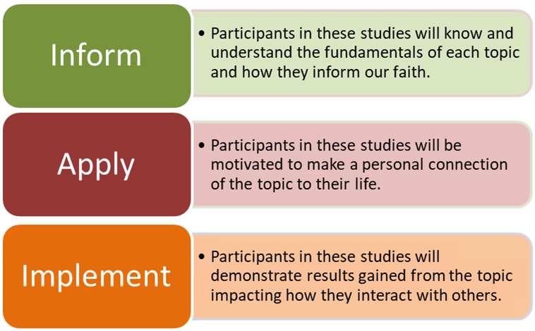 Purpose: To help people become more fully committed and better equipped to follow Christ and share our faith according to the resources and gifts He has given to us.